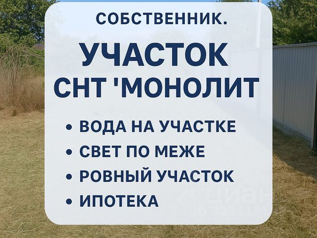 Продам участок в СНТ "Монолит" (уч. 534),межевание сделано.Межевание сделано. Расположение: 4-й участок от начала 3-й клетки Площадь: 5 соток Участок ровный, без построек и фундаментов Электричество — столб по меже, 10 см от забора Вода — на участке Документы готовы, ипотека возможна Собственник Звоните/пишите для подробностей!