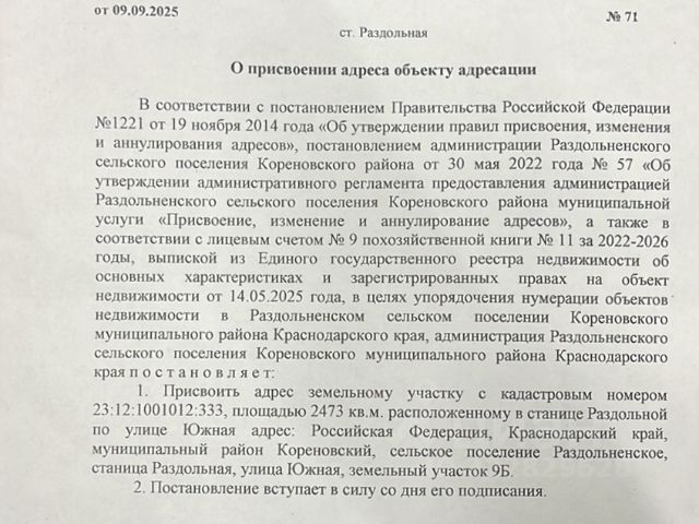 Имущество предлагается к продаже, на ЭТП ALFALOT.RU. Для детального ознакомления с объектом и условиями его продажи, найдите данные торги по номеру в меню поиска на ЭТП. Номер процедуры (торгов): 184111. Форма реализации: Открытый аукцион. Дата начала приема заявок: 02.10.2025 00:00 Дата окончания приема заявок: 07.11.2025 00:00 Описание лота от организатора: Земельный участок с кадастровым номером 23:07:0805015:52, вид разрешенного использования: для строительства 6-ти этажного многоквартирного жилого дома с конторскими помещениями и организацией двухуровневых квартир на 5-6 этажах, площадью 3 460 кв.м., местоположение: Краснодарский край, р-н Динской, ст. Динская, ул. Кирова, 107, вид права, доля в праве: общая долевая собственность, доля в праве 58/3460, дата регистрации: 05.08.2014 г. Купить земельный участок без посредников в станице Раздольная Кореновского района.