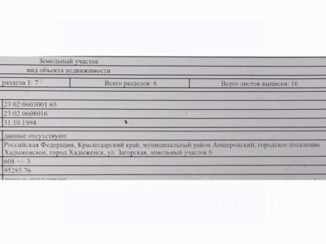 Продам земельный участок 6.08 соток в г.Хадыженск, Загорская 6. Участок ровный, правильной формы, расчищен, находится в черте города,отмежеван, стоит на кадастровом и регистрационном учётах, границы вынесены на местность. На участок подведено электричество (установлен столб и счетчик). Центральный водопровод с вкусной питьевой водой расположен рядом с участком. Документы оформлены, готовы к продаже. Участок находится в красивейшем месте, тихом, уютном, рядом горы, лес, речка Хадажка, место называют "Маленькая Швейцария". Участок расположен на возвышенности, что исключает подтопления. Соседи живут постоянно. В 10мин пешком находится источник с минеральной питьевой водой схожий по составу с Ессентуки 4.13, которую можно набрать бесплатно. Развитая инфраструктура. 20мин пешком до ближайшей школы, магазина и центральной больницы. До Краснодара 100км, до Туапсе 70км. Скоростная электричка через Хадыженск, едет вдоль всего побережья от Туапсе до Сочи. Один соственник, без обременений.