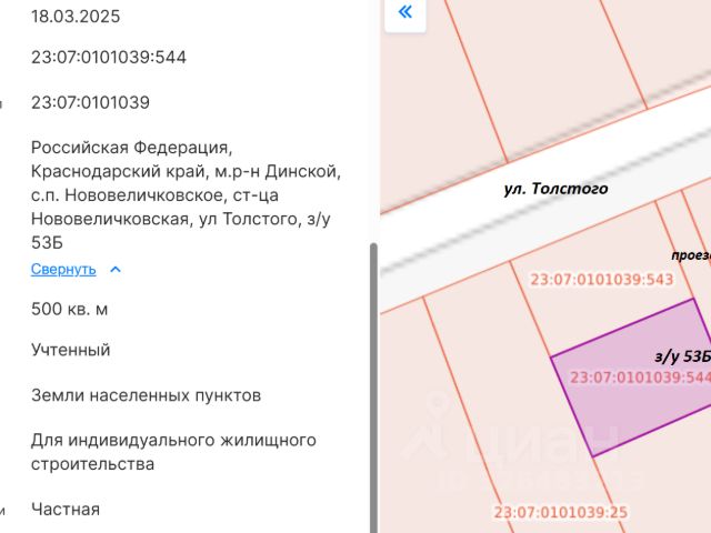 Продам земельный участок под личное подсобное хозяйство, земли населённых пунктов. Краснодарский край, Калининский район, село Гришковское, ул. Широкая, 50. Кадастровый номер 23:10:0703001:351. Участок ровный, разработанный. Рядом дорога и электричество. В посёлке газ, местный водопровод, школа, дом культуры, сбербанк, почта, магазины, детские площадки. На данный момент участок находится на земле сельхозназначения. В 2024 году категория его земли будет изменена на жилую застройку, проект уже разработан градостроительным отделом. Через год на нём можно будет строить жилой дом. Один собственник.