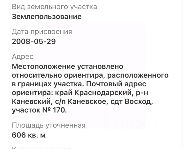 Продается участок с Электричеством! 6 соток прямоугольной формы (Земли населенных пунктов; Земельный участок садоводческих товариществ) от Собственника. Возможна прописка. Участок ровный и сухой. Хороший подъезд. Кадастровый номер 23:25:0124025:16. Координаты 46.0877293, 38.2104683. Проведен вынос точек земельного участка в натуру, имеются указатели. - Море 2 км. - Автобусная остановка 500 метров. - Город 3 км. К участку подведено Электричество - 10 кВт, на основании заключенных Договоров с филиалом АО "Россети Кубань" Тимашевских электрических сетей и энергосбытовой компанией ПАО ТНС энерго Кубань (Все документы в порядке, при необходимости все предоставлю). ДОПОЛНИТЕЛЬНО могу продать смежный с нему участок, тоже 6 соток с Электричеством! Все готово для строительства дома! Прекрасное место для отдыха!