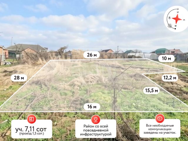 Земельный участок площадью 6,25 соток правильной формы с фасадом 17,5 метров предлагает оптимальные условия для строительства индивидуального жилого дома. Участок готов к началу строительных работ и представляет собой удачное капиталовложение в собственное жилье или перспективный актив в развивающемся районе. Участок полностью соответствует требованиям государственных программ, включая "Семейную ипотеку". Четкая геометрия и значительная ширина фронтальной части обеспечивают максимальную свободу при проектировании здания и планировке прилегающей территории, позволяя рационально разместить дом, гараж, зоны отдыха и сад. Объект расположен в перспективном Юго-Западном районе, где активно ведется современная жилая застройка. Район сочетает спокойную атмосферу с отличной транспортной доступностью: в непосредственной близости находятся ключевые магистрали, обеспечивающие быстрый выезд в любую часть города. Важным преимуществом является выгодное географическое положение всего региона: расстояние до побережья Азовского моря в районе поселков Ачуево и Кучугуры составляет около 50 км, а до популярных курортов Черноморского побережья — Анапы, Новороссийска и Геленджика — от 90 до 130 км, что открывает возможности для комфортных поездок на море в течение всего теплого сезона. Звоните - и Мы поможем Вам осуществить свою жилищную МЕЧТУ !!! . Дополнительно оплачивается комиссия с покупателя. Код пользователя: 197853 Номер в базе: 11880299