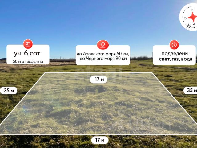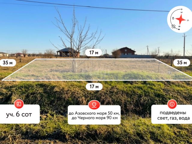 Земельный участок 50 метров от асфальта, площадью 6 соток с фасадом 17 метров, подходит под Семейную ипотеку. К границам участка подведены все необходимые центральные коммуникации — электричество, водопровод, газ. Удобная вытянутая форма и значительная ширина фасада обеспечивают простор для планировки дома и ландшафтного дизайна. Участок расположен в активно развивающемся новом Юго-Западном районе. Местоположение района обеспечивает баланс между тишиной жилой зоны и транспортной доступностью к основным магистралям. Город обладает выгодным географическим положением: до побережья Азовского моря (п. Ачуево, п. Кучугуры Славянского района)— 50 км, до Черноморского побережья (г. Анапа, г. Новороссийск, Геленджик) —90/130 км. Звоните - и Мы поможем Вам осуществить свою жилищную МЕЧТУ !!! . Дополнительно оплачивается комиссия с покупателя. Код пользователя: 197853 Номер в базе: 12111959