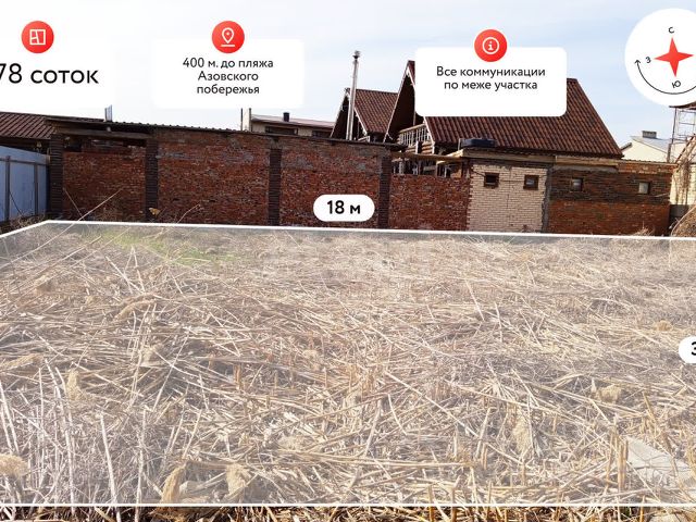 Объект 168184. УЧАСТОК В 700 МЕТРАХ ОТ ПЛЯЖА!!! СТАНИЦА ГОЛУБИЦКАЯ!!! КУРОРТ НА БЕРЕГУ АЗОВСКОГО МОРЯ!!! Продается участок на побережье Азовского моря!!! * Район активно застраивается * В начале улицы уже подвели газ. * В планах центральное водоснабжение * Рядом аквапарк, зоопарк "Лукоморье", мультипарк и другие развлечения * В шаговой доступности сетевые магазины, кафе, аптеки и много другое Успейте приобрести участок на берегу моря!!!