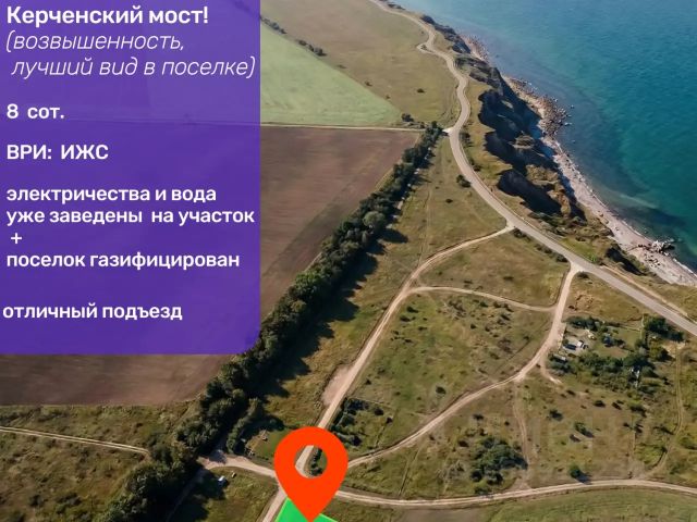 СРОЧНО!!!!Земельный участок с Красивейшим видом на Керченский мост из всего поселка (максимальная близость на возвышенности)! Расположение поселка по маршруту федеральной трассы к Керченскому мосту, удобный выезд по щебеночному покрытию дороги на транспортную развязку. 15 мин и вы в Керчи!!! 5 мин и вы у залива Азовского моря, 15 мин к открытому Черному морю со стороны пос. Волна. Уникальная местность (виноградники, грязевые источники, морской целебный воздух). Утвержден новый генплан Таманского поселения Темрюкского района с перспективой полной инфраструктуры. В 3,5 км новая поликлиника, детсад, многоэтажка с коммерцией. Рядом КП Винная Деревня, открытый исторический комплекс Атамань, центр энологии- Винодельня Chateau Tamagne, вулкан с целебными грязями и тд Земельный участок 8 сот. Категория земель (ИЖС) Коммуникации (электричество, вода) на участке с заключёнными договорами поставки. Поселок газифицирован. Ведутся работы по индивидуальному подключению домовладений. Электричество на участке. Вода из централизованной скважины. Также Фундамент под дом 10x9м. При стр-ве основания применялись материалы усиленной прочности (бетон М-300, арм 32). Есть разрешительная докумениация на строительство. Проект на домовладение. Удобный спуск к заливу 500м с песчанным пляжем и ценной ракушкой. Рыбная ловля, рапаны, подводная охота, экстримальный спорт. Поселок активно застраивается и развивается. Возможен разумный торг реальному покупателю. ОБЪЕКТ готов к продаже.