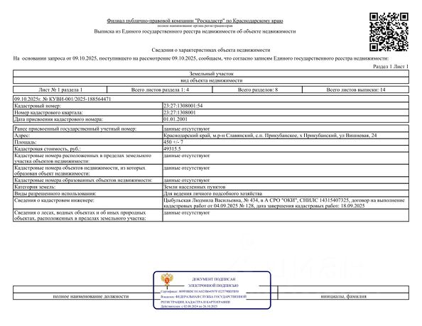 Продам земельный участок площадью 4.5 сотки, расположен Славянский район, x. Прикубaнский, улица Вишневая д. 24. Кадастровый номер 23:27:1308001:54. Категория: земли населенных пунктов. Назначение: для ведения личного подсобного хозяйства. Электpичеcтво - подключено - 15 кВт, газ, водоснабжение проходят по улице Вишневая. Участок сухой, ровный, правильной формы, расположен на гравийной дороге. Недалеко — новая транспортная развязка на трассу Краснодар Керчь. Остановка в 10 минутах ходьбы. Ходит 2 маршрутных автобуса 114 и 107 До транспортной развязки Краснодар- Керчь - 5 минут, До центра г. Славянска-на-Кубани 20 минут, До центральной части г. Краснодара 1 час 20 минут, До Черноморского побережья Анапы 1 час 20 минут, До Черноморского побережья Южного берега Крыма 3 часа. До Азовского побережья 1 час 20 минут. Радом расположены: - Школа 14, - Детский сад 47, - МФЦ, - Поликлиника, - Почта, - 3 продуктовых магазина, хозтовары, Wildbеrriеs, ОZОN, Аптека. Рядом река Кубань — отличное место для отдыха и рыбалки Живописная природа, чистый воздух Тихое и спокойное место для жизни и дачного отдыха. Участок расположен в шаговой доступности от реки, где можно купаться, рыбачить или просто наслаждаться видом на водную гладь. Земля плодородная, подходит как для садоводства, так и для капитального строительства. Все документы в порядке, собственник.