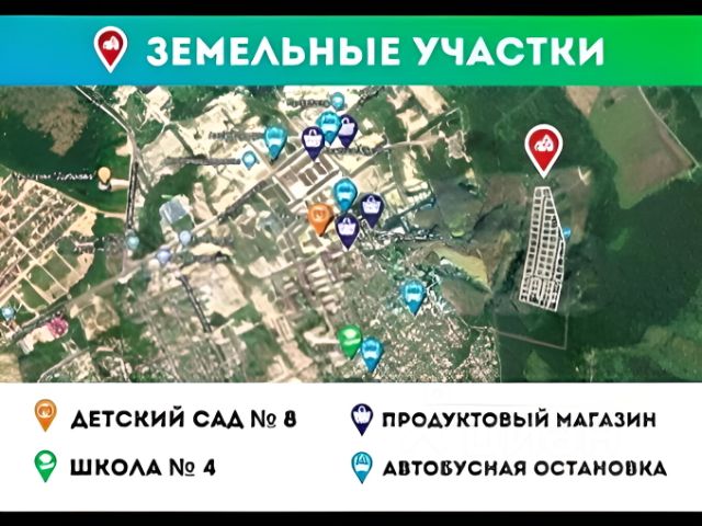 Радом с участками расположена школа, два детских сада. В пешей доступности супермаркет, аптека, рынок.