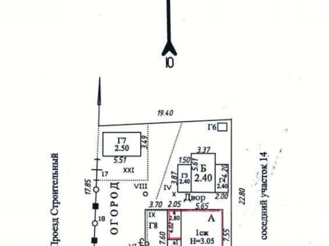 20 Х 40 м, ровный, высокое место квартала -подвалы не затапливаются. С обоих сторон участка - дороги. С запада зона отчуждения 6 м. С востока проходит газ среднего давления, поэтому большая зона отчуждения 12х20 м, засажена деревьями. З.у. отмежеван