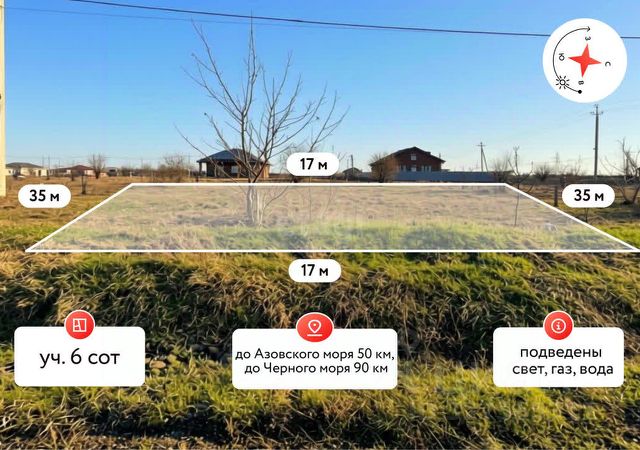 Земельный участок площадью 6 соток с фасадом 17 метров, подходит под Семейную ипотеку. К границам участка подведены все необходимые центральные коммуникации — электричество, водопровод, газ. Удобная вытянутая форма и значительная ширина фасада обеспечивают простор для планировки дома и ландшафтного дизайна. Участок расположен в активно развивающемся новом Юго-Западном районе. Местоположение района обеспечивает баланс между тишиной жилой зоны и транспортной доступностью к основным магистралям. Город обладает выгодным географическим положением: до побережья Азовского моря (п. Ачуево, п. Кучугуры Славянского района)— 50 км, до Черноморского побережья (г. Анапа, г. Новороссийск, Геленджик) —90/130 км. Звоните - и Мы поможем Вам осуществить свою жилищную МЕЧТУ !!! . Дополнительно оплачивается комиссия с покупателя. Код пользователя: 197853 Номер в базе: 11952910