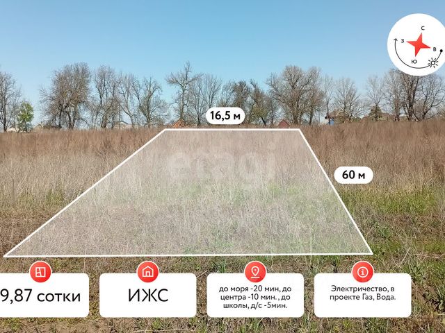 Продается земельный участок площадью 9,76 сот. в черте г. Темрюка, в активно застраиваемом районе где будут только новые дома. Назначение участка ИЖС. Электричество подведено. Газ рядом, вода - прокладывается центральный водопровод. Канализация планируется септик. Участок ровный, без перепадов по высоте, прямоугольной формы, по фасаду 16,5 м в глубину 60 м. Участку присвоен адрес. До остановки "Раздолье" на ул. 27 Сентября - 100 м, школа 15 и дет. сад - 6 мин. езды на а/м, до центра города - 12 мин. езды на а/м. Продажа от единственного собственника, обременений нет. До Черного моря Анапы 50 км, до Азовского моря ст. Голубицкая 15 км. Успевайте приобрести участок ИЖС в черте города по низкой цене на старте продаж. Помогу с выбором надежного застройщика по выгодным ценам. Звоните прямо сейчас, на связи 24/7.. Дополнительно оплачивается комиссия с покупателя. Код пользователя: 187282 Номер в базе: 12393441