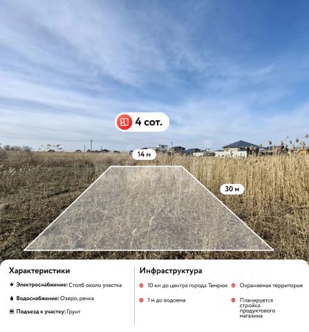Продается земельный участок от собственника площадью 4,35 сот, идеально подходящий для рыбалки, с собственным выходом озеро. С этого озера есть выход в реку Кубань и Азовское море. Фасад земельного участка 14 метров, а глубина 30 метр, что позволяет поставить дачу, вагончик и организовать свою зону отдыха! Можете быть спокойны - вся территория массива полностью охраняется 24/7, и есть возможность установить камеру видеонаблюдения на Вашем участке! До центра города Темрюк 10 км, подъездные пути к дому грунтовые и доступны в любую погоду. В пяти минутах на автомобиле расположены магазины Пятерочка, Магнит, Победа Чижик и т.д. Выход на канал открывает безграничные возможности для водных развлечений и рыболовных приключений. Документы готовы к продаже! Обременений нет! Данное предложение по отличной цене! Не упустите возможность стать владельцем отличного земельного участка! Звоните, чтобы узнать подробности и задать все интересующие вопросы!. Дополнительно оплачивается комиссия с покупателя. Код пользователя: 187299 Номер в базе: 12260688