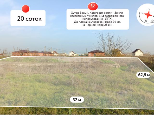 Код объекта: 10442. Продаётся земельный участок площадью 20 соток в х. Белый Участок правильной прямоугольной формы с широким фасадом 32 метра. При необходимости можно разделить на 2 независимых участка, при этом фасад каждого будет 16 метров. Участок находится в районе коттеджной застройки. Жилой массив в котором уже построено не мало современных, красивых домов. Коммуникации: Свет, ГАЗ - по меже участка. Вода - скважина, канализация - септик. Удобные подъездные пути - широкая, ровная дорога отсыпана гравием. В хуторе есть детский сад и школа. Так же есть медпункт, почта, Дом Культуры , АЗС, магазины, отделение банка. Расстояние до г. Темрюк 16 км ( Азовское море), до г. Анапа 30 км. ( Чёрное море). Сделано межевание, полный пакет документов!