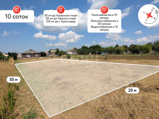 Земельный участок правильной формы с фасадом 20 метров и площадью 10 соток в посёлке Светлый путь Ленина. Участок подойдет под постройку дома для всей семьи! Школа 20 в 10 минутах ходьбы, детский сад 19 в 10 минутах ходьбы. Магазины Пятёрочка, Магнит, ПВЗ WB и OZON, сельский дом культуры и многое другое в шаговой доступности! Транспортная доступность - автобусная остановка "Светлый Путь Ленина 2" в 5 минутах ходьбы, Азовское море (ст. Голубицкая) в 40 мин езды, Чёрное море (г. Анапа / ст. Благовещенская) в 1 часе езды, Крымский мост 1 часе езды, город Краснодар в 1,5 часах езды. Про коммуникации - газоснабжение в 10 метрах; электроснабжение в 50 метрах; водоснабжение в 10 метрах. Участок по рыночной цене! Есть вопросы? Звоните!. Дополнительно оплачивается комиссия с покупателя. Код пользователя: 187291 Номер в базе: 9259365