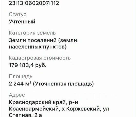 Продаётся земельный участок площадью - 26 соток, с ветхим домовладением. Расположен в живописном, спокойном месте хутора Тиховский, на правом берегу реки Кубань, от которой так-же берёт своё начало река Протока - обе судоходные. Идеальное место для семейного отдыха, коллективной рыбалки и водных прогулок по речной глади. Предлагаемое место находится в конце улицы Победы ( в тупике), что гарантирует отсутствие автомобильного движения и шума. С восточной стороны к участку, по всей длине (90 м), примыкает искусственный канал, который можно наполнить водой и развести рыбу - собственный рыбопитомник. Подъезд из твёрдого покрытия (г.п.с.), улица широкая - 35 метров. Перед фасадом - 15 соток свободной территории, возможна коллективная автостоянка личного транспорта. Вдоль улицы, на противоположной стороне, проходит сетевой газопровод. Электричество и водопровод заведены во двор. По хутору частично проложен асфальт, остальные улицы покрыты ГПС. Место нахождения: Краснодарский край, Красноармейский район, хутор Тиховский, улица Победы, 35. Ближайшие города: Славянск на Кубани - 13 км, до Краснодара - 87 км, Новороссийск (Чёрное море) - 101 км. Коммерческая сторона предложения: данный земельный участок, расположен в 6,3 км от действующей автомобильной дороги А-289 "Темрюк-Краснодар-Кропоткин" и 1,2 км от вновь строящейся трассы А-289 "Краснодар-Славянск на Кубани-Темрюк", пропускная способность которой 39 500 автомобилей в сутки, срок сдачи дороги в эксплуатацию - конец 2024 года, хутор Тиховский находится по середине дистанции этого пути. Цена предложения - 100 000 руб/сот. Присутствует вариант постройки необходимых зданий и сооружений моими ресурсами (квалифицированные строители).