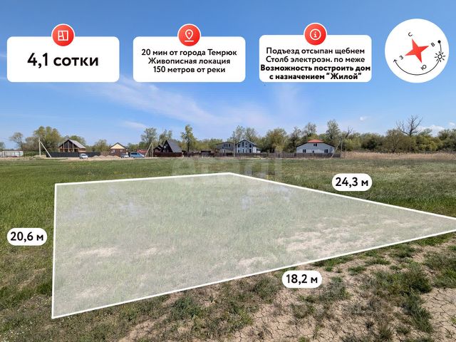 В продаже земельный участок в очень перспективном и живописном месте площадью 4,1 сот. Темрюкского района! 150 метров от реки! Земельный участок площадью 4,1 сот. Имеет правильную форму. Параметры участка: фасад 18,2 м, глубина 24,3 м. Участок ровный, без уклона. Коммуникации: электроснабжение по меже, водоснабжение скважина, канализация септик. Транспортная доступность: Азовское море (ст. Голубицкая) в 30 км, Чёрное море (г. Анапа) в 40 км, Крымский мост в 65 км, г. Краснодар в 160 км. Земельный участок находится в прекрасном и тихом месте в непосредственной близости к реке Казачий Ерик, на территории имеется зона для беседки, спуск к воде, лодочная пристань. В 900 метрах асфальтированная дорога (работы идут полным ходом), по дороге к участку находится долина лотосов. Все эти факторы делают данный земельный участок крайне перспективным и инвестиционным! Допустимо строительство ЖИЛОГО дома с возможностью постоянной регистрации! Заинтересовало предложение? Звоните!. Дополнительно оплачивается комиссия с покупателя. Код пользователя: 187291 Номер в базе: 12315109