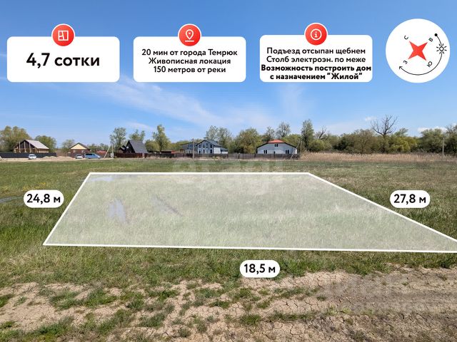 В продаже земельный участок в очень перспективном и живописном месте площадью 4,7 сот. Темрюкского района! 150 метров от реки! Земельный участок площадью 4,7 сот. Имеет правильную форму. Параметры участка: фасад 18,5 м, глубина 27,8 м. Участок ровный, без уклона. Коммуникации: электроснабжение по меже, водоснабжение скважина, канализация септик. Транспортная доступность: Азовское море (ст. Голубицкая) в 30 км, Чёрное море (г. Анапа) в 40 км, Крымский мост в 65 км, г. Краснодар в 160 км. Земельный участок находится в прекрасном и тихом месте в непосредственной близости к реке Казачий Ерик, на территории имеется зона для беседки, спуск к воде, лодочная пристань. В 900 метрах асфальтированная дорога (работы идут полным ходом), по дороге к участку находится долина лотосов. Все эти факторы делают данный земельный участок крайне перспективным и инвестиционным! Допустимо строительство ЖИЛОГО дома с возможностью постоянной регистрации! Заинтересовало предложение? Звоните!. Дополнительно оплачивается комиссия с покупателя. Код пользователя: 187291 Номер в базе: 12315302