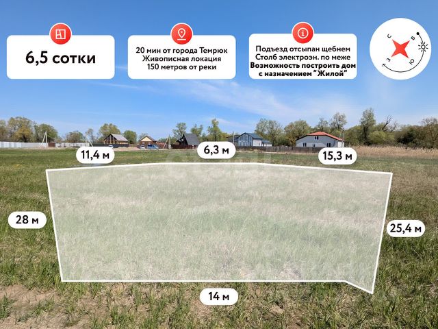 В продаже земельный участок в очень перспективном и живописном месте площадью 6,5 сот. Темрюкского района! 150 метров от реки! Земельный участок площадью 6,5 сот. Имеет правильную форму. Параметры участка: фасад 14 м, глубина 28 м. Участок ровный, без уклона. Коммуникации: электроснабжение по меже, водоснабжение скважина, канализация септик. Транспортная доступность: Азовское море (ст. Голубицкая) в 30 км, Чёрное море (г. Анапа) в 40 км, Крымский мост в 65 км, г. Краснодар в 160 км. Земельный участок находится в прекрасном и тихом месте в непосредственной близости к реке Казачий Ерик, на территории имеется зона для беседки, спуск к воде, лодочная пристань. В 900 метрах асфальтированная дорога (работы идут полным ходом), по дороге к участку находится долина лотосов. Все эти факторы делают данный земельный участок крайне перспективным и инвестиционным! Допустимо строительство ЖИЛОГО дома с возможностью постоянной регистрации! Заинтересовало предложение? Звоните!. Дополнительно оплачивается комиссия с покупателя. Код пользователя: 187291 Номер в базе: 12315331