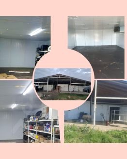 На участке расположен склад 210 кв.м.Выполнен из термопанелей.Внутри длинный стеллаж.Высота потолков 2м.Пол так же из панелей термостойких сверху закрыт ламинированной финской фанерой.Ровный можно закатывать на поддонах товар.