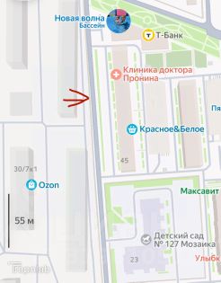 Помещение выходит на дорогу, ведущую к детскому саду. Рядом прогулочная аллея, отдельно стоящий Магнит с большой парковкой.