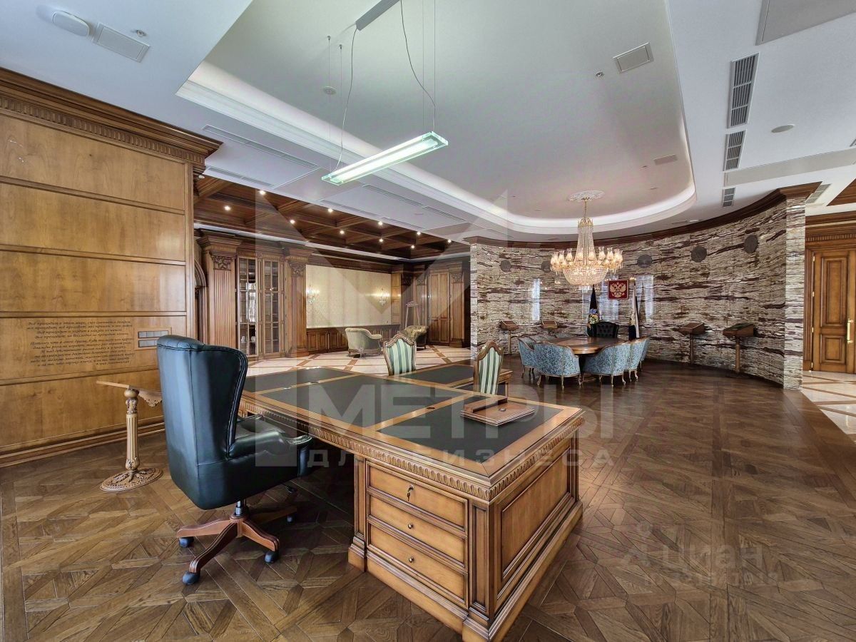 Президентский кабинет 234,8 кв.м - с круглым столом для совещаний и зоной с мягкой мебелью для переговоров, гостиная с камином (67,2 кв.м) и санузлом, комната отдыха с душем и гардеробной.