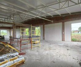 550 м2 прямоугольной формы, два центральных входа, два разгрузочных выхода на площадку для разгрузки шириной 6 метров. Также в этом помещении выделена техническая зона (котельная-электрощитовая, два сан.узла, комната для персонала и директора)