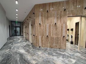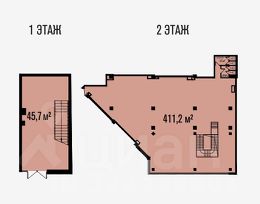 Помещение занимает два этажа: входная группа 46 кв.м. на 1 этаже, основной зал 411 кв.м. на 2 этаже