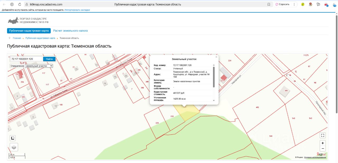 адрес (местоположение) Тюменская обл., р-н Тюменский, д. Кыштырла, ул. Народная, участок 160; - кадастровый номер 72:17:1002001:120; - площадь 1 425 кв.м; - разрешенное использование для строительства индивидуального жилого дома и хозяйственно-бытовых строений; - категория земель земли населенных пунктов; - территориальная зона зона застройки индивидуальными жилыми домами (Ж1).