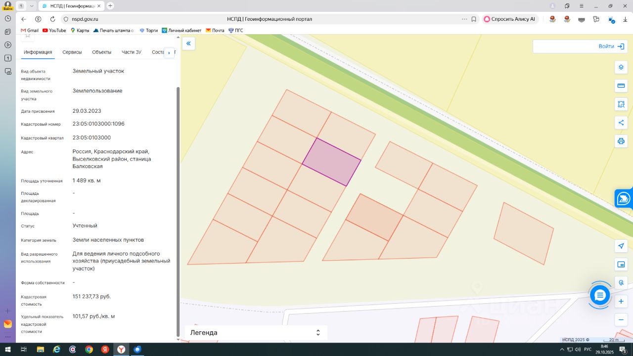 кадастровый номер 23:05:0103000:1096, находящийся в государственной собственности, категория земель - земли населенных пунктов, площадью 1489 кв. м, расположенный по адресу: Россия, Краснодарский край, Выселковский район, ст. Балковская, вид разрешенного использования: для ведения личного подсобного хозяйства (приусадебный земельный участок). Сроком на 20 лет.