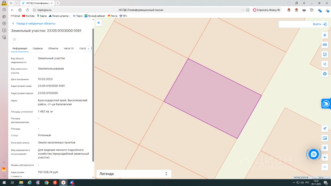 с кадастровым номером 23:05:0103000:1091, находящийся в государственной собственности, категория земель - земли населенных пунктов, площадью 1482 кв. м, расположенный по адресу: Краснодарский край, Выселковский район, ст. Балковская, вид разрешенного использования: для ведения личного подсобного хозяйства (приусадебный земельный участок). Сроком на 20 лет.