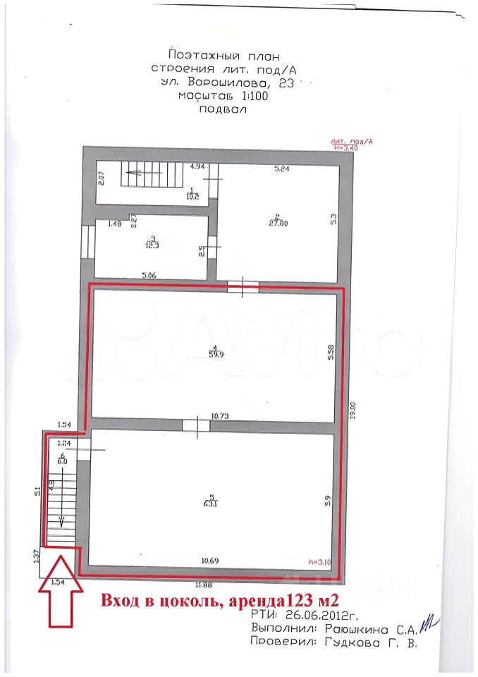 Помещение 123 м2 с ремонтом и отдельным входом, расположено в цокольном этаже.