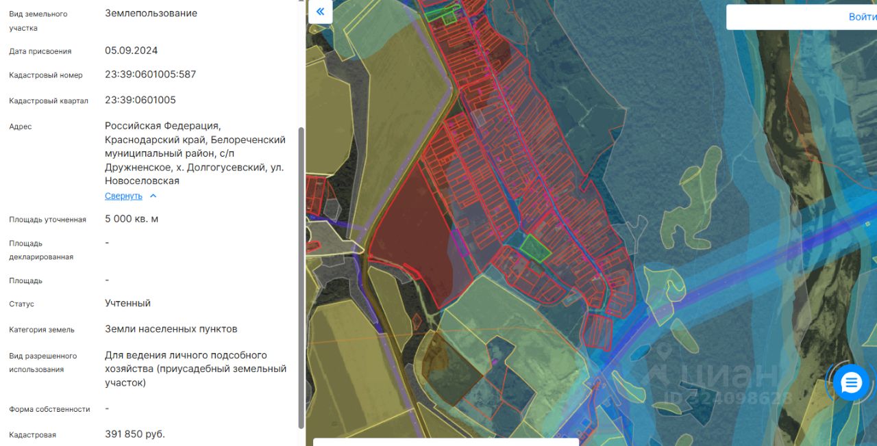 Земельный участок, расположенный по адресу:Российская Федерация, Краснодарский край, Белореченский район, Дружненское с/п., х. Долгогусевский, ул. Новоселовская, площадью 5000 кв.м., кадастровый номер 23:39:0601005:587, категория земель земли населенных пунктов, разрешенный вид использования для ведения личного подсобного хозяйства (приусадебный земельный участок).