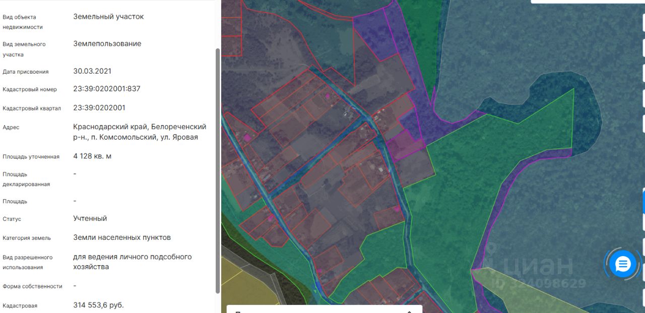 Земельный участок, расположенный по адресу:Российская Федерация, Краснодарский край, Белореченский район, Первомайское с/п., п. Комсомольский, ул. Яровая, площадью 4128 кв.м., кадастровый номер 23:39:0202001:837, категория земель земли населенных пунктов, разрешенный вид использования для ведения личного подсобного хозяйства.