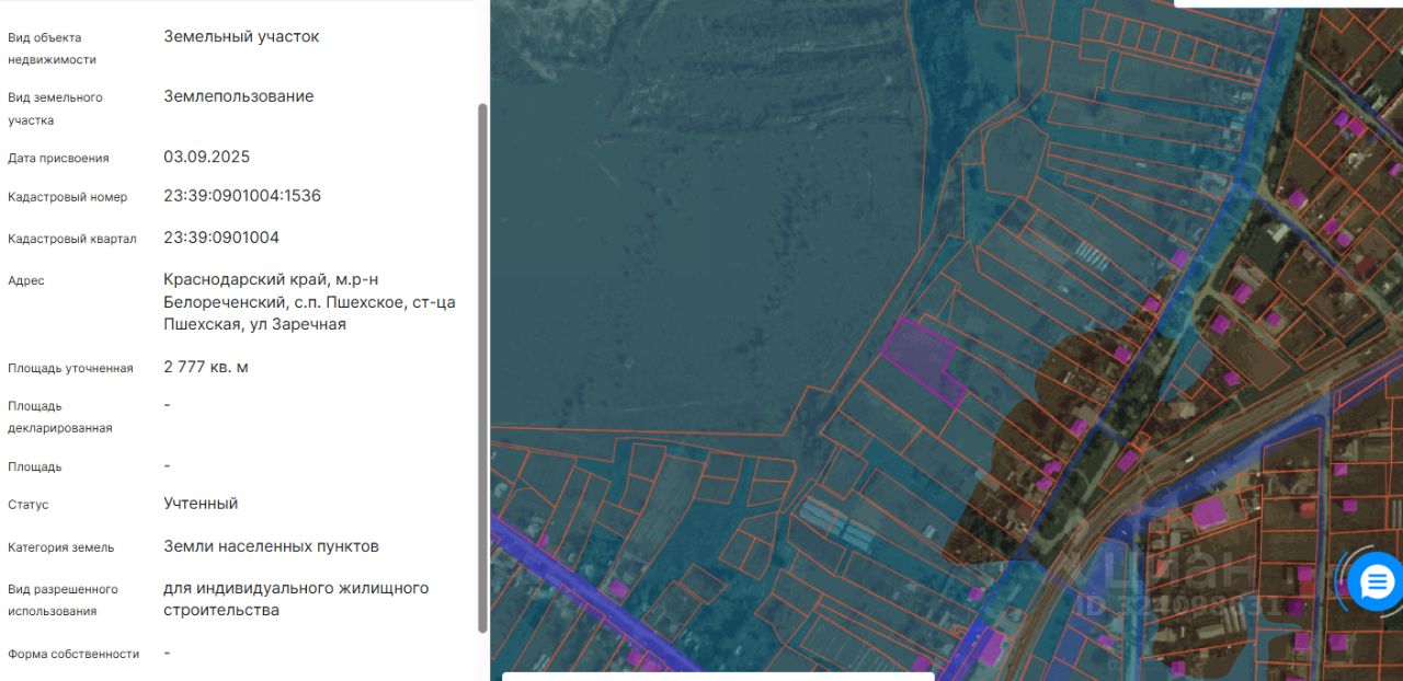 Земельный участок, расположенный по адресу:Российская Федерация, Краснодарский край, Белореченский муниципальный район, Пшехское с/п., ст. Пшехская, ул. Заречная, площадью 2777 кв.м., кадастровый номер 23:39:0901004:1536, категория земель земли населенных пунктов, разрешенный вид использования для индивидуального жилищного строительства