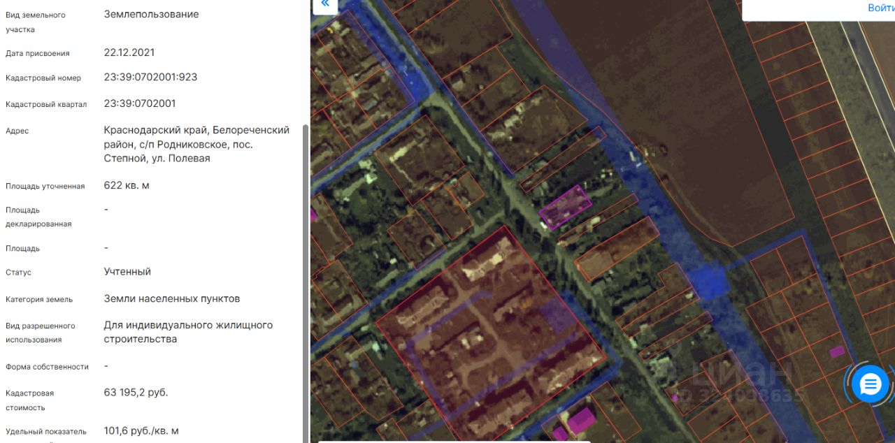 Земельный участок, расположенный по адресу:Российская Федерация, Краснодарский край, Белореченский муниципальный район, Родниковское с/п., п. Степной, ул. Полевая, площадью 622 кв.м., кадастровый номер 23:39:0702001:923, категория земель земли населенных пунктов, разрешенный вид использования для индивидуального жилищного строительства