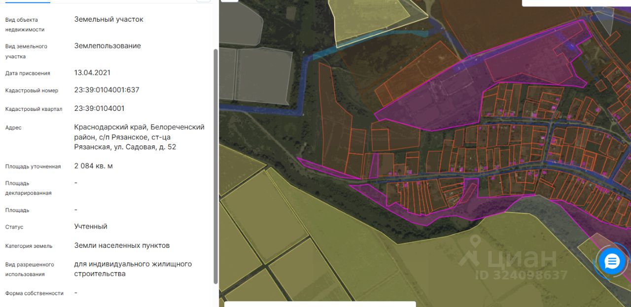 Земельный участок, расположенный по адресу:Российская Федерация, Краснодарский край, Белореченский муниципальный район, Рязанское с/п., ст. Рязанская, ул. Садовая, 52, площадью 2084 кв.м., кадастровый номер 23:39:0104001:637, категория земель земли населенных пунктов, разрешенный вид использования для индивидуального жилищного строительства