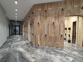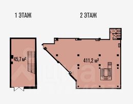 Помещение занимает два этажа: входная группа 46 кв.м. на 1 этаже, основной зал 411 кв.м. на 2 этаже