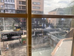 Расположение - фасад на оживленную проезжую часть - ул. Железнодорожная, высокий пешеходный и автомобильный трафик, остановка трамвая. Численность населения микрорайона превышает 10 000 человек.