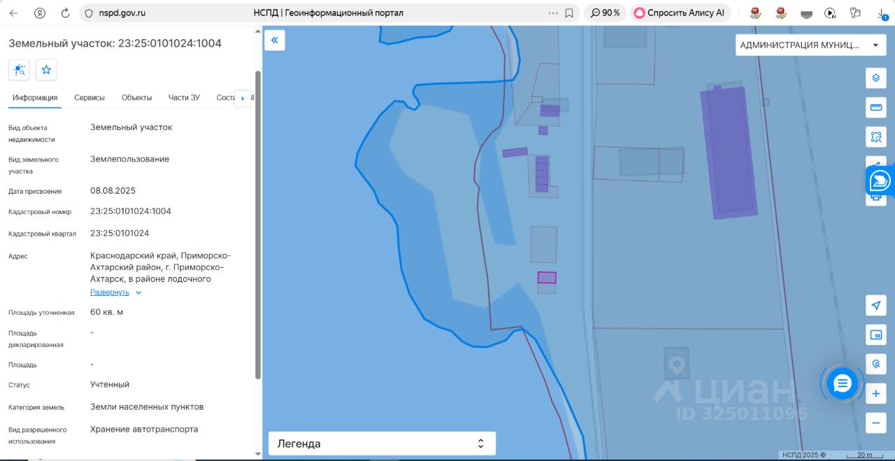 Земельный участок, расположенный по адресу: Краснодарский край, Приморско-Ахтарский район, г. Приморско-Ахтарск, в районе лодочного кооператива "Южный", из состава земель населенных пунктов, с разрешенным видом использования хранение автотранспорта, с кадастровым номером 23:25:0101024:1004, площадью 60 кв.м.