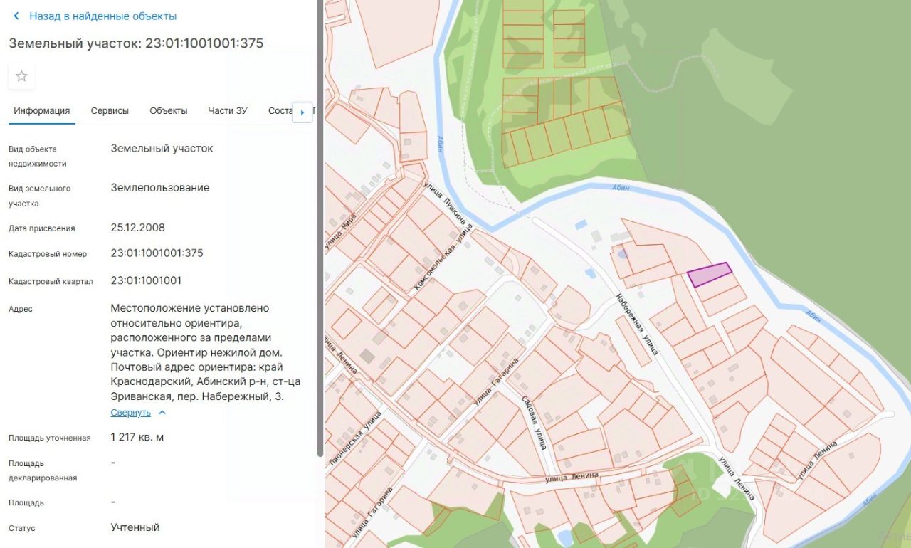 Земельный участок из земель населенных пунктов с кадастровым номером 23:01:1001001:375, местоположение: Краснодарский край, Абинский район, станица Эриванская, переулок Набережный, 3, площадью 1217 кв. м., с видом разрешенного использования индивидуальное жилищное строительство.