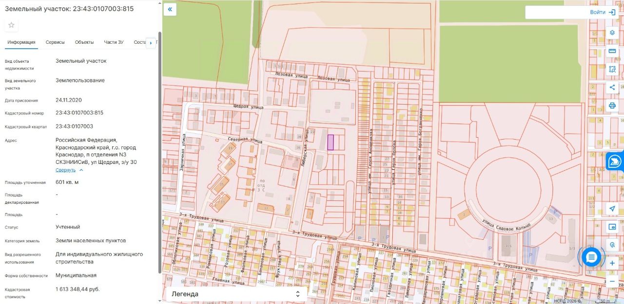 ЛОТ 1062-З Право заключения договора аренды земельного участка, расположенного по адресу: Российская Федерация, Краснодарский край, городской округ город Краснодар, п. отделения 3 СКЗНИИСиВ, ул. Щедрая, з/у 30, площадь 601 кв.м, форма собственности: муниципальная (муниципальное образование город Краснодар (собственность от 24.11.2020 23:43:0107003:815-23/226/2020-2), категория земель: земли населённых пунктов, с кадастровым номером 23:43:0107003:815