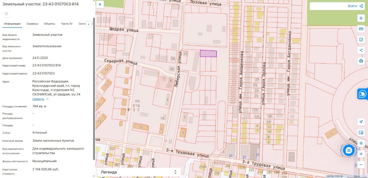 ЛОТ 1066-З Право заключения договора аренды земельного участка, расположенного по адресу: Краснодарский край, городской округ город Краснодар, поселок отделения 3 СКЗНИИСиВ, улица Щедрая, земельный участок 24, площадь 784 кв.м, форма собственности: муниципальная (муниципальное образование город Краснодар (собственность от 24.11.2020 23:43:0107003:814-23/226/2020-2), категория земель: земли населённых пунктов, с кадастровым номером 23:43:0107003:814