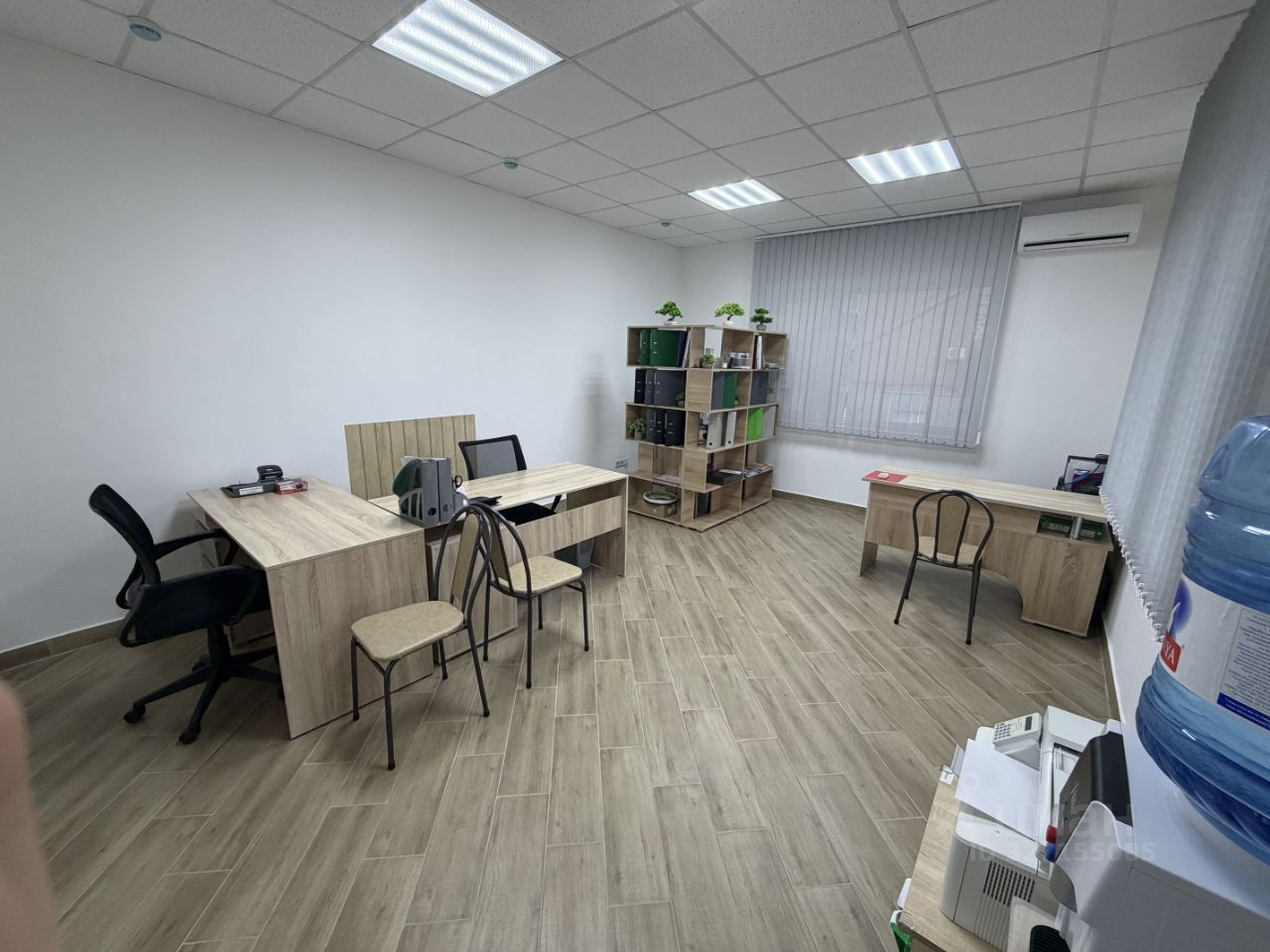 Три стола, один из них под руководителя, всё новое, два стула на рабочих местах, три стула для посетителей. Уборная рядом на этаже.