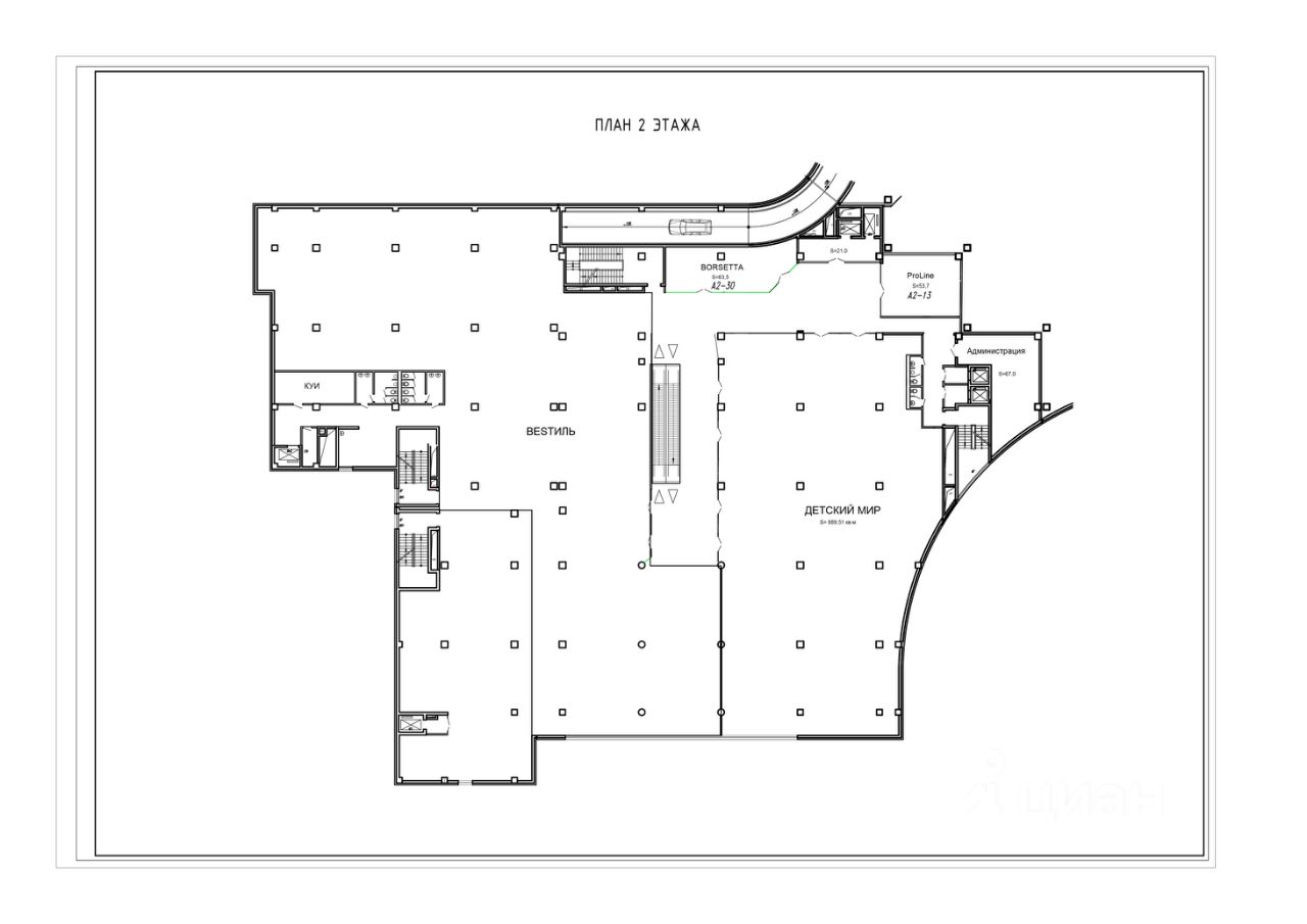 Четырехэтажное здание имеет продуманную структуру зонирования. Цокольный уровень полностью отведен под оптово-розничные магазины с большим ассортиментом. Три верхних этажа включают галерею магазинов постоянного спроса, товаров переменного спроса и импульсных покупок. Компактное зонирование пространства делает покупки удобными даже при высокой посещаемости.
