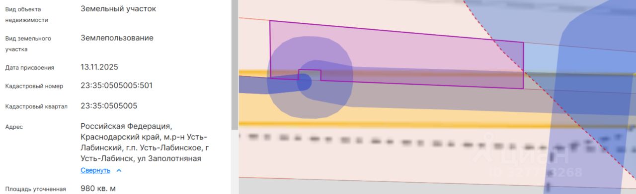Земельный участок с кадастровым номером 23:35:0505005:501, площадью 980 кв. м., расположенного по адресу: Российская Федерация, Краснодарский край, м.р-н Усть-Лабинский, г.п. Усть-Лабинское, г Усть-Лабинск, категория земель: земли населенных пунктов, вид разрешенного использования: служебные гаражи