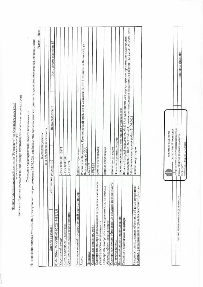 Земельный участок, расположенный по адресу: Российская Федерация, Краснодарский край, Славянский муниципальный район, Целинное сельское поселение, пос. Целинный, ул. Черемушки, земельный участок 27А