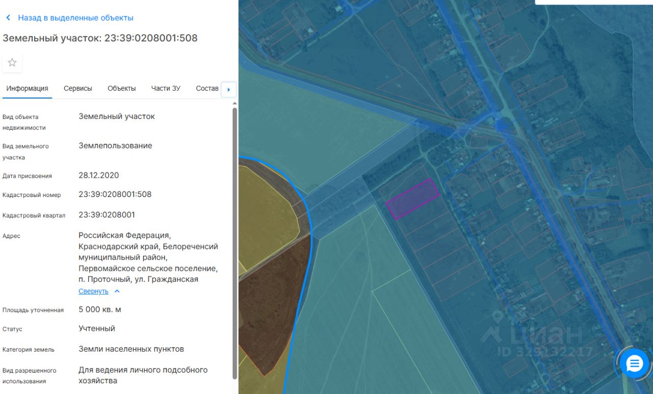 Земельный участок, расположенный по адресу:Российская Федерация, Краснодарский край, Белореченский район, Первомайское с/п., п. Проточный, ул. Гражданская, площадью 5000 кв.м., кадастровый номер 23:39:0208001:508, категория земель земли населенных пунктов, разрешенный вид использования ведение личного подсобного хозяйства