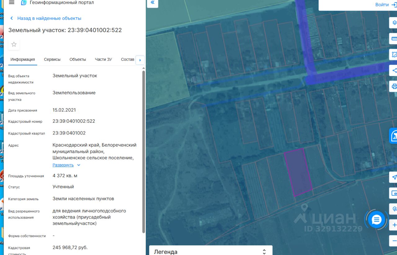 Земельный участок, расположенный по адресу:Российская Федерация, Краснодарский край, Белореченский муниципальный район, Школьненское с/п., х. Привольный, ул. Степная, площадью 4372 кв.м., кадастровый номер 23:39:0401002:522, категория земель земли населенных пунктов, разрешенный вид использования для ведения личного подсобного хозяйства (приусадебный земельный участок)