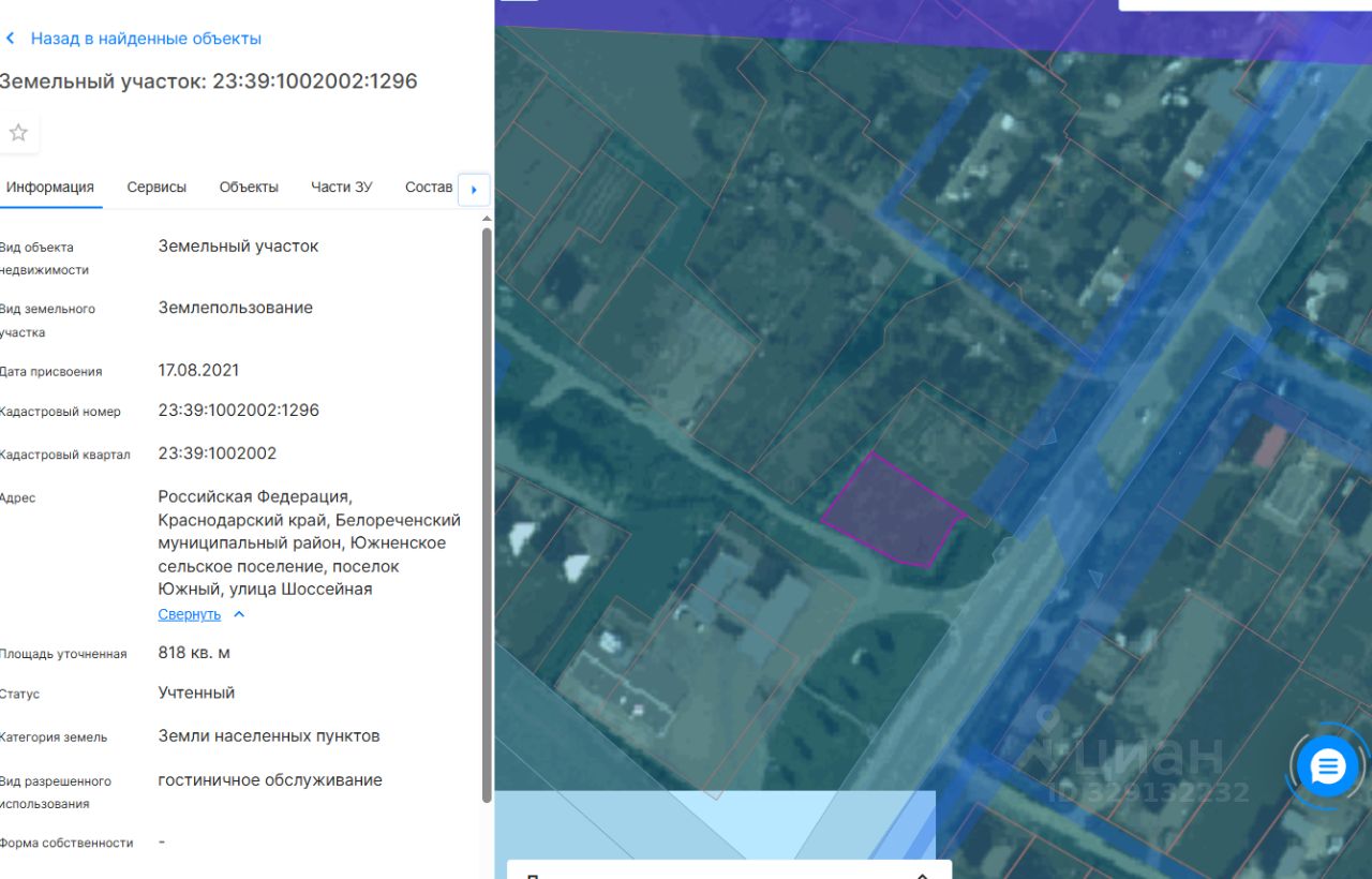 Земельный участок, расположенный по адресу:Российская Федерация, Краснодарский край, Белореченский муниципальный район, Южненское с/п., п. Южный, ул. Шоссейная, площадью 818 кв.м., кадастровый номер 23:39:1002002:1296, категория земель земли населенных пунктов, разрешенный вид использования гостиничное обслуживание.