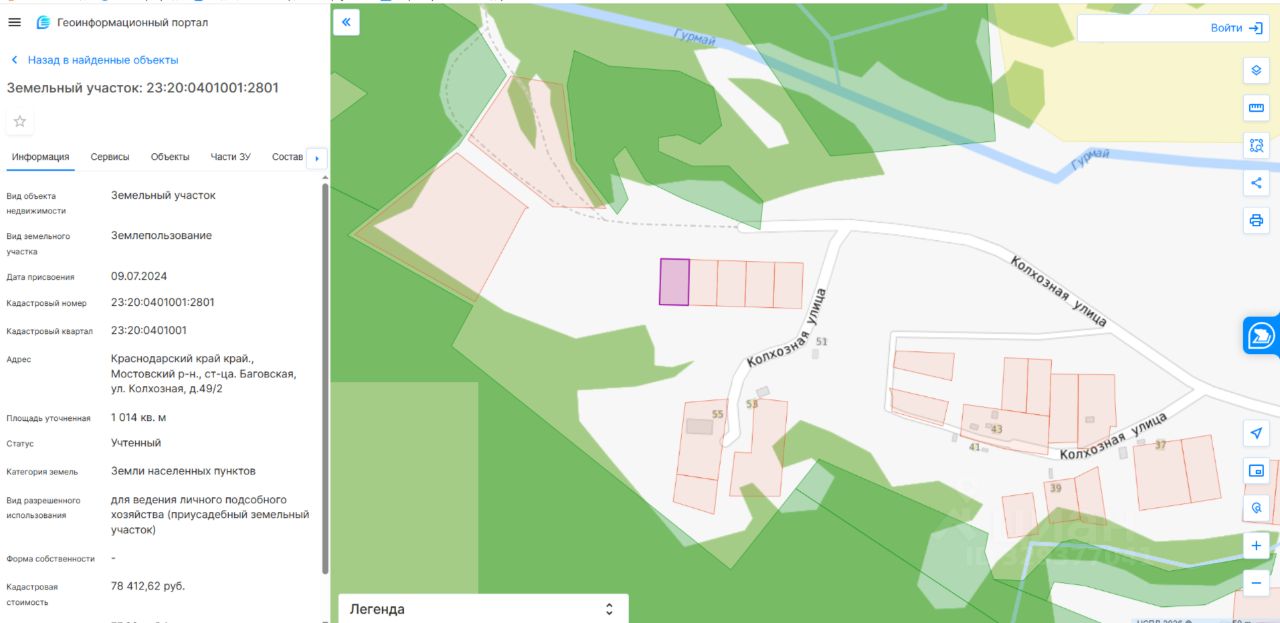 Земельный участок площадью 1014 кв.м, с кадастровым номером 23:20:0401001:2801, местоположение участка: Краснодарский край, Мостовский район, станица Баговская, улица Колхозная, дом 49/2, разрешенное использование: для ведения личного подсобного хозяйства (приусадебный земельный участок), категория земель: земли населенных пунктов.