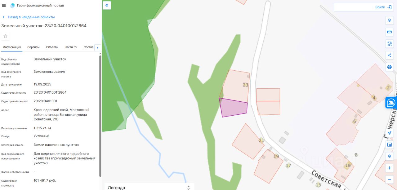 Земельный участок площадью 1315 кв.м, с кадастровым номером 23:20:0401001:2864, местоположение участка: Краснодарский край, Мостовский район, станица Баговская, улица Советская, дом 21Б, разрешенное использование: для ведения личного подсобного хозяйства (приусадебный земельный участок), категория земель: земли населенных пунктов.